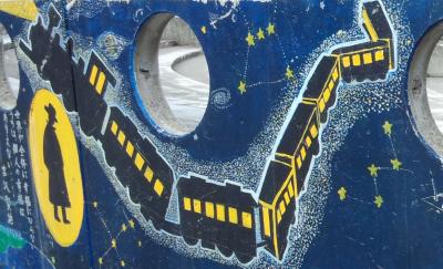 (写真は8年前、旧大川小に行ったとき撮ったプールの壁画です。子供と先生が仲良く描いた銀河鉄道です。)