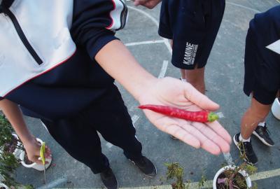 真っ赤に実ったとうがらし、みんなで採集です。みるからに辛そうで、おいしそうです。 授業では、このあと一味唐辛子をつくるのでしょうか。楽しみです。 |