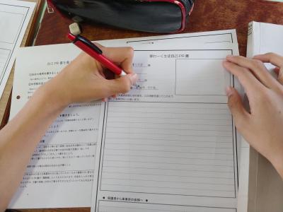 前回の総合的な学習の時間では事業所に渡す自己PR書の作成を行いました。自分の得意なこと、頑張っていること、夢わーくで頑張りたいことをよく考え、丁寧に作成しましょう。