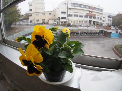 相談室の窓辺にパンジーです。相談員石黒さんが「川口駅前で見つけてふっと購入しちゃったんです」とおっしゃってました。小さな花ですが、相談室を訪ねた人や登校した生徒をやさしい気持ちにしてくれていました。