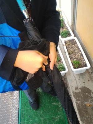 登校した生徒が玄関先で手袋を脱いで、素手で濡れた傘をクルリと巻いて小さくとじていました。