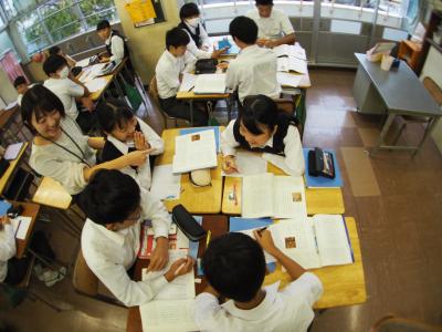 小原教諭と3年生徒らが、松尾芭蕉の「光堂」を詠んだ時の心情を読み解く授業に臨んでいました。