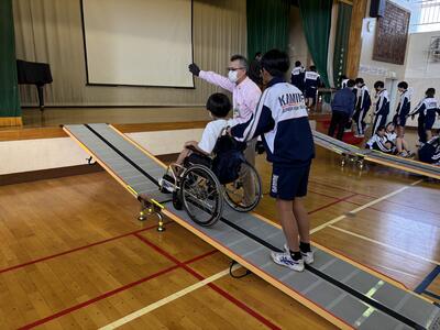 体育館には4つのコーナーがあり、車椅子に乗って坂道を押したり、体におもりをつけて歩きづらさを体験したり、高齢者の方とお話をさせていただき、自分が気になったことを質問したりしました。