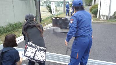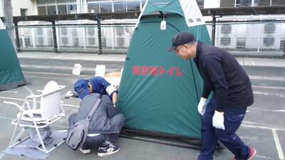 マンホールトイレ組立訓練や水消火器取扱い訓練、煙体験などが行われました。
