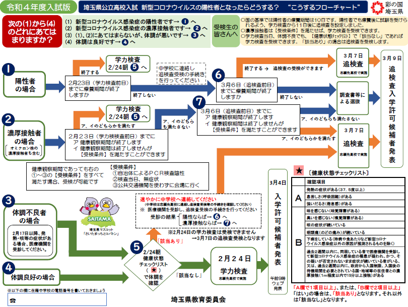 埼玉県教育員会ホームページには『埼玉県公立高校入試 新型コロナウイルスの陽性者となったらどうする? “こうするフローチャート”』と『濃厚接触者となったら』が掲載されています。